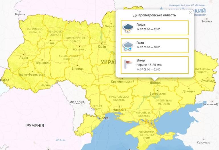 В ближайшее время с сохранениями до конца дня 14 июля в городе Днепр и Днепропетровской области ожидается гроза. Уровень опасности 1 (желтый).