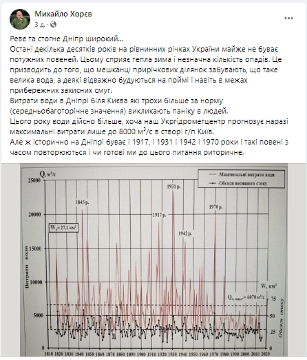 В свою очередь Михаил Хорев, гидролог и экс-заместитель министра защиты окружающей среды и природных ресурсов, отметил, что наводнения в Украине со временем повторяются – они были и в 1917, и в 1931, и в 1942, и в 1970 годах. Последние несколько десятков лет их почти не было на равнинных реках Украины из-за теплой зимы и небольшого количества осадков.