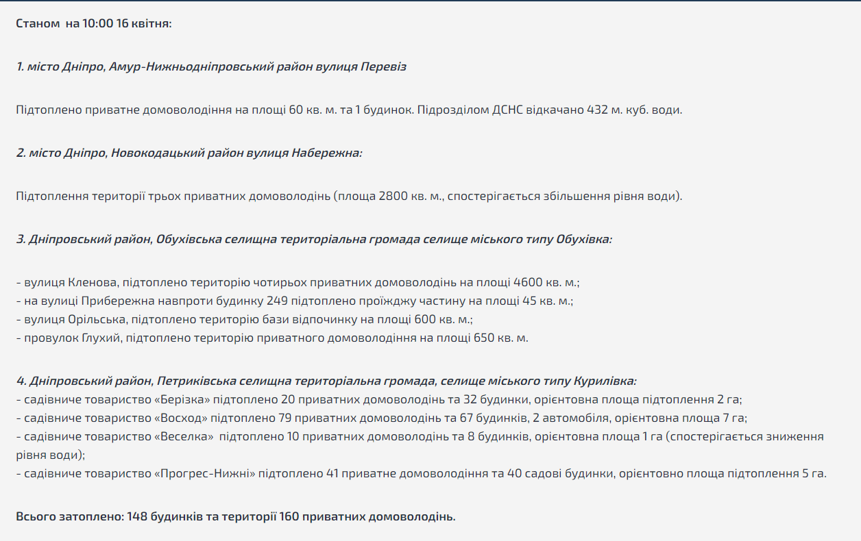 В поселке Куриловка Петриковской поселковой территориальной громады отмечалось подтопление трех садовых товариществ. Совершив объезд территорий, специалисты ГСЧС установили, что подавляющее количество подтопленных зданий – это дачные дома, из которых в ночное время люди уезжают. Дома, в которых люди живут постоянно, не затоплены.