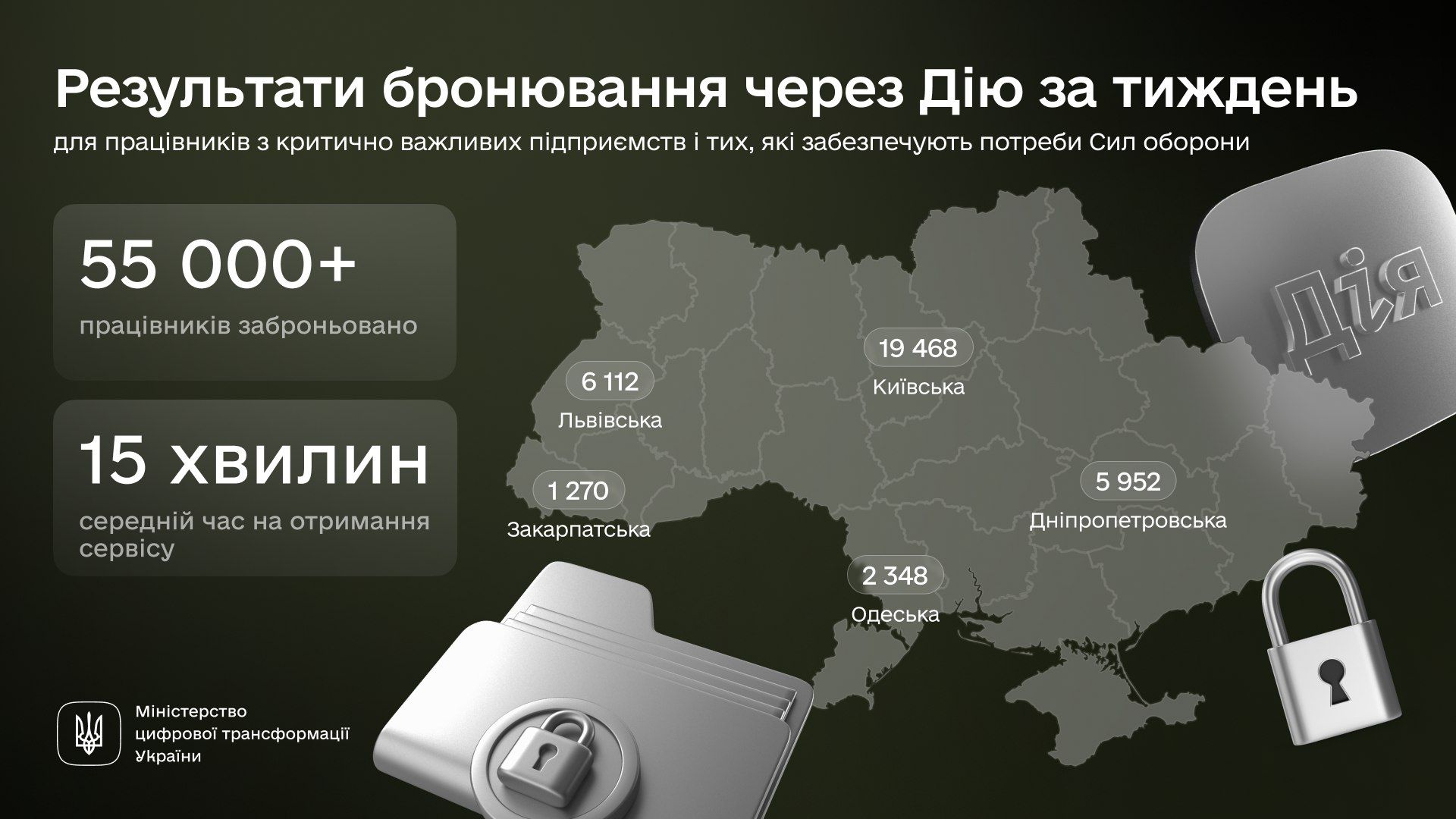 По данным "Дії" этой услугой воспользовались более 55 тысяч раз. Днепропетровская область попала в тройку лидеров по бронированию работников критически важных предприятий.