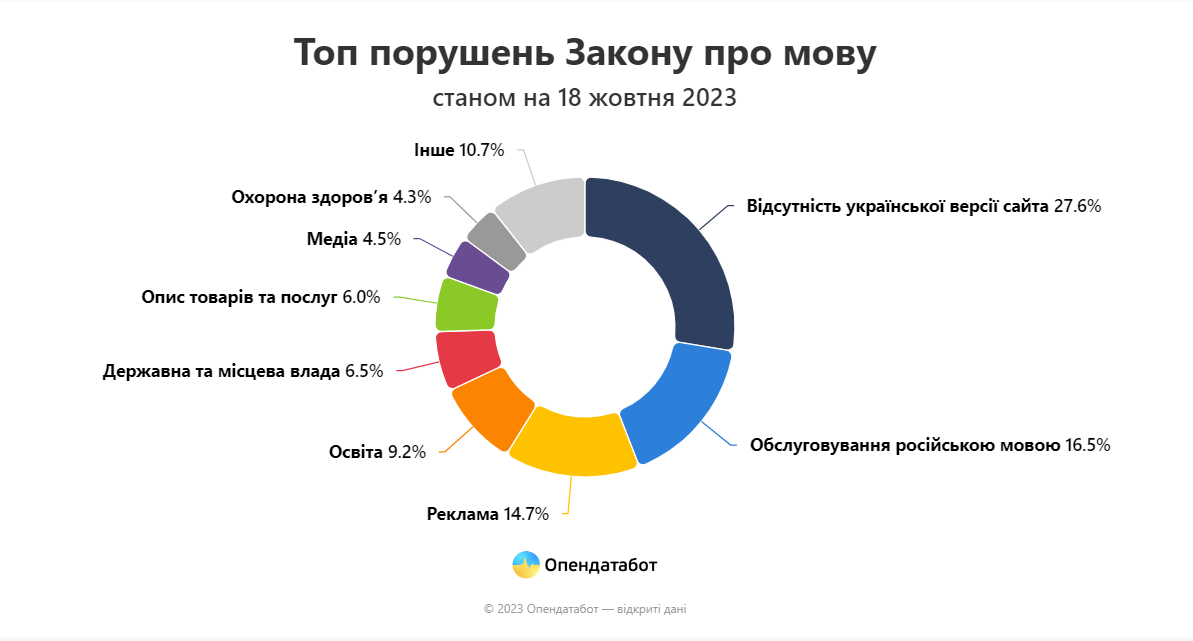 Чаще всего украинцы жалуются на нарушение языкового закона в программном обеспечении и на сайтах, преимущественно это отсутствие украинской версии сайта. На втором месте – жалобы на обслуживание потребителей. Далее следуют обращения о нарушении языкового закона в рекламе, образовании и органах государственной и местной власти. Полный список: