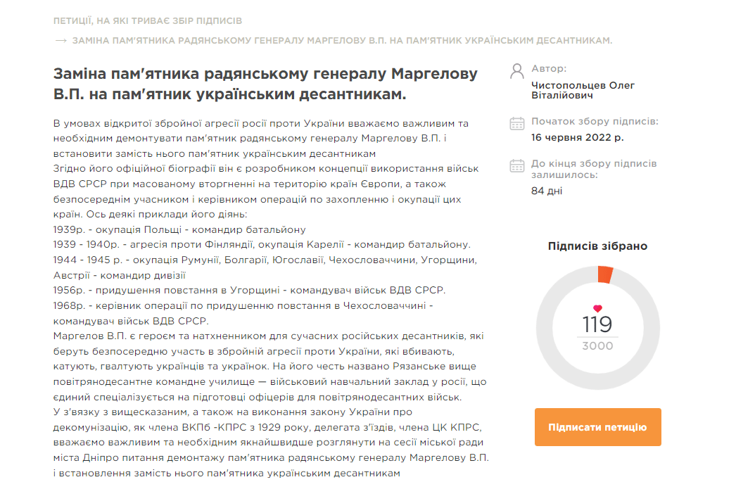 Прошение появилось на сайте петиций мэру Днепра 16 июня и набрало пока всего 119 подписей из 3000, необходимых для рассмотрения его местной властью. Автор петиции также считает, что фигура Маргелова вдохновляет десантников рф продолжать войну против Украины.