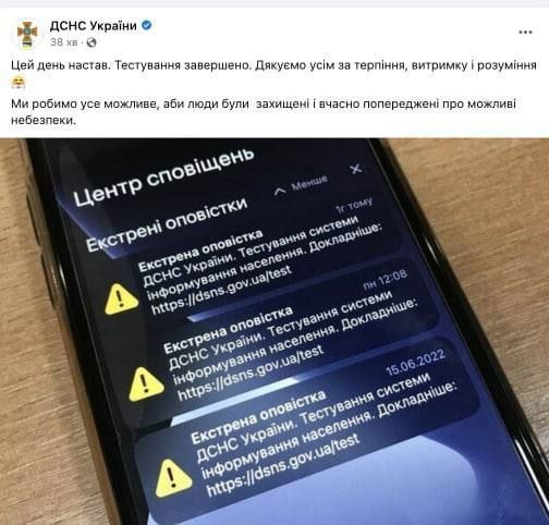 В ГСЧС сообщили, что наконец-то завершили тестирование системы уведомлений. Чрезвычайники поблагодарили украинцев за терпение и понимание.