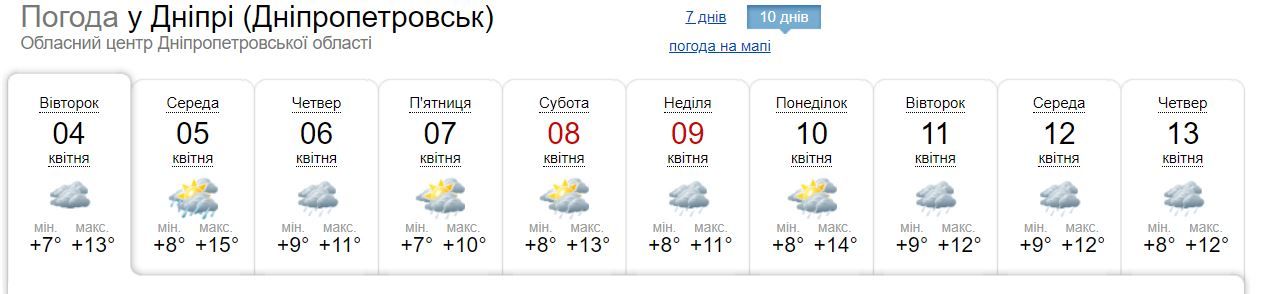 Что касается Днепра, то уже завтра в городе немного потеплеет - до +17, но до 13 апреля почти каждый день будут дожди. Осадки уйдут от нас уже после 16 апреля, и где-то в 20 числах этого месяца начнется весенняя жара, когда температура воздуха прогреется до +25 градусов тепла.