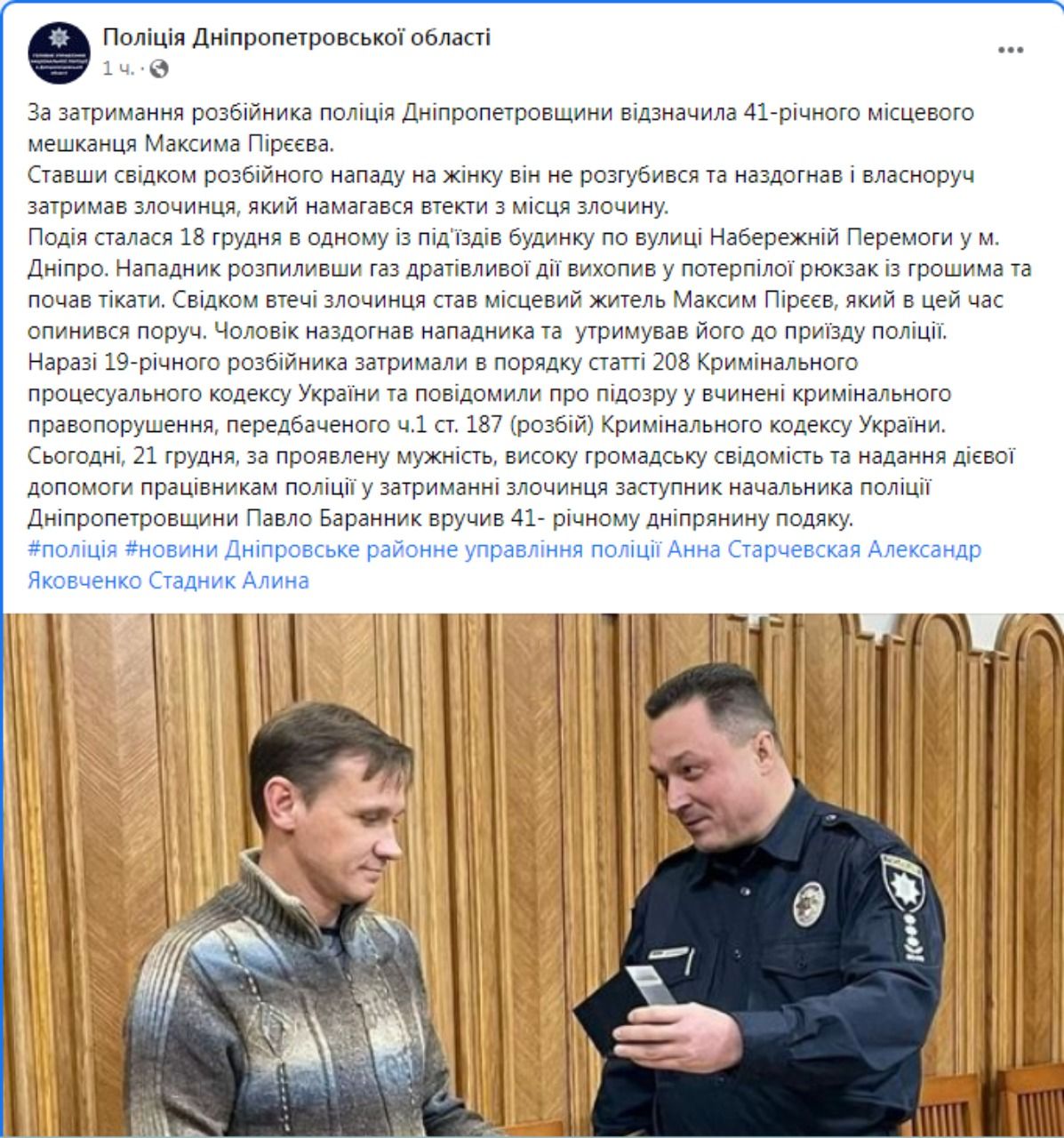 А уже сегодня, 21 декабря, Максиму Пирееву заместитель начальника полиции Павел Баранник вручили грамоту за проявленное мужество, высокую общественную сознательность и оказание действенной помощи сотрудникам полиции в задержании преступника.