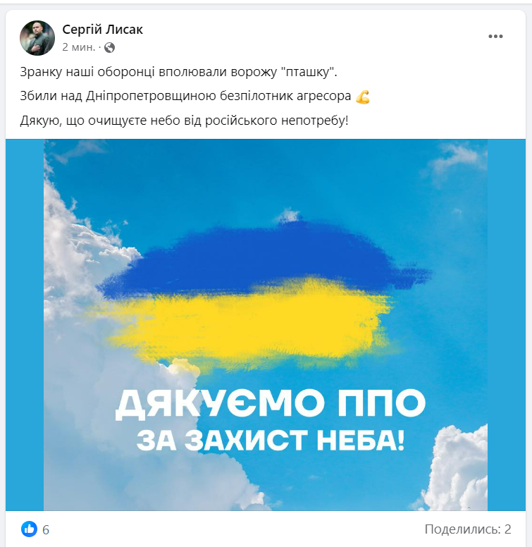 Утром наши защитники споймали вражескую "птичку". Сбили над Днепропетровщиной беспилотник агрессора. Спасибо, что очищаете небо от российского хлама! – написал Сергей Лысак.`