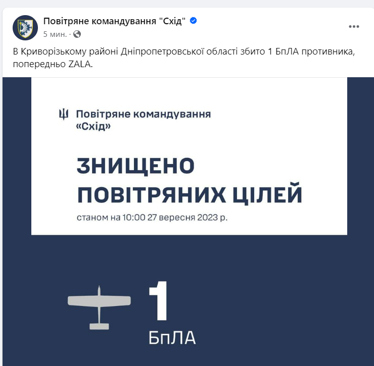Обновлено: в воздушном командовании "Схід" сообщили, что БПЛА сбили в Криворожском районе. Предварительно, это был ZALA – беспилотник, предназначенный для ведения разведки.