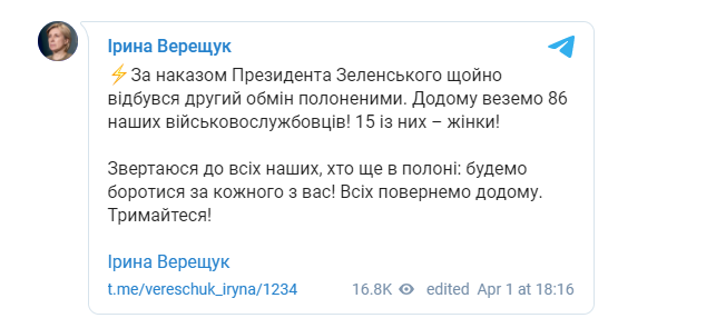 Сегодня, 1 апреля, между Украиной и рф состоялся второй полноценный обмен военнопленными.