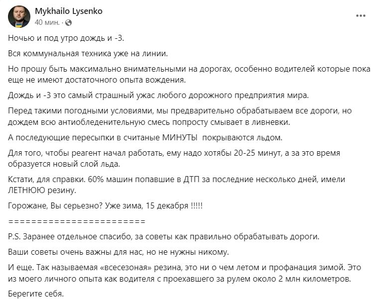 «Заранее отдельное спасибо за советы, как правильно обрабатывать дороги. Ваши советы очень важны для нас, но не нужны никому. Берегите себя», - заключил Михаил Лысенко.