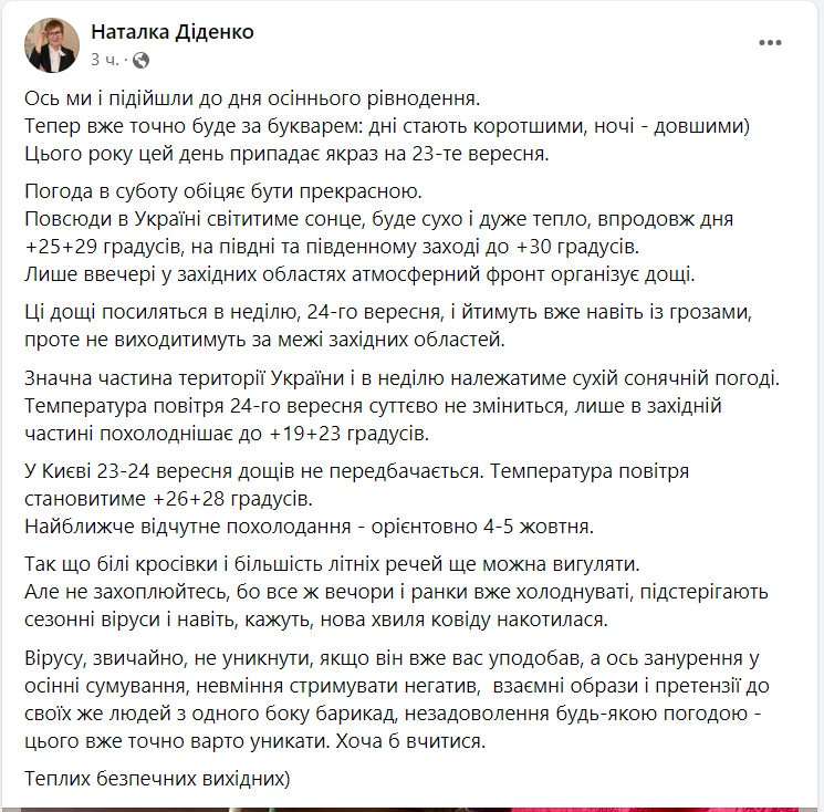 Так что белые кроссовки и большинство летних вещей еще можно выгулять. Но не увлекайтесь, потому что все же вечера и утра уже холодноватые, подстерегают сезонные вирусы и даже, говорят, новая волна ковида нахлынула, – написала синоптик.