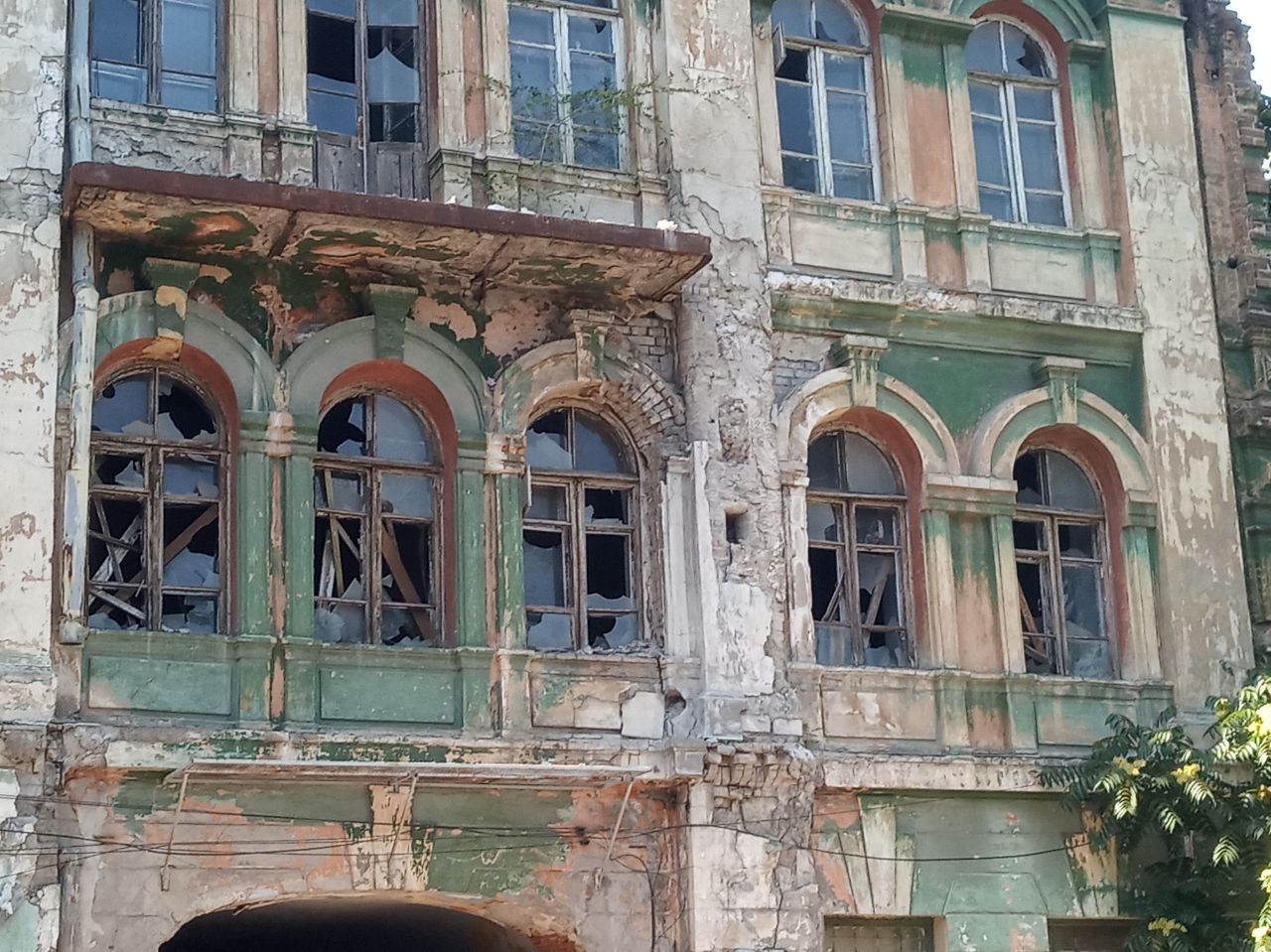 С фасада облупилась зеленая краска, отваливается штукатурка. Большинство окон разбиты хулиганами.