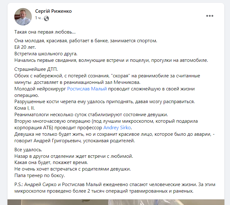 По его словам, врачи продолжают бороться за жизнь 20-летней девушки. После аварии нейрохирурги сделали ей сложнейшую операцию. Пришлось поднимать разрушенные кости черепа, чтобы дать мозгу «расправиться». До этого пациентка находилась в коме, но медикам удалось стабилизировать ее состояние.