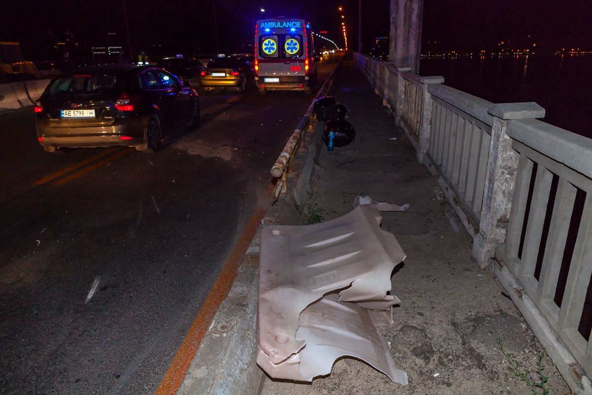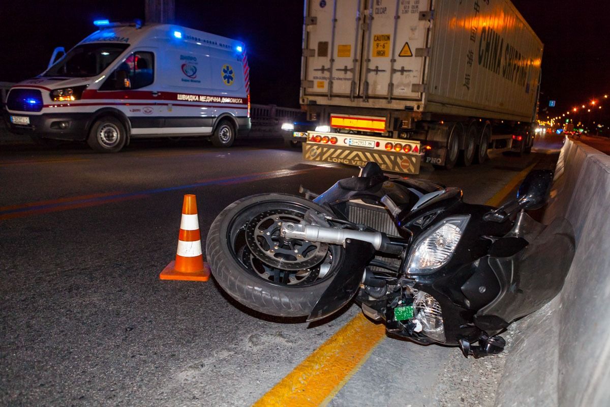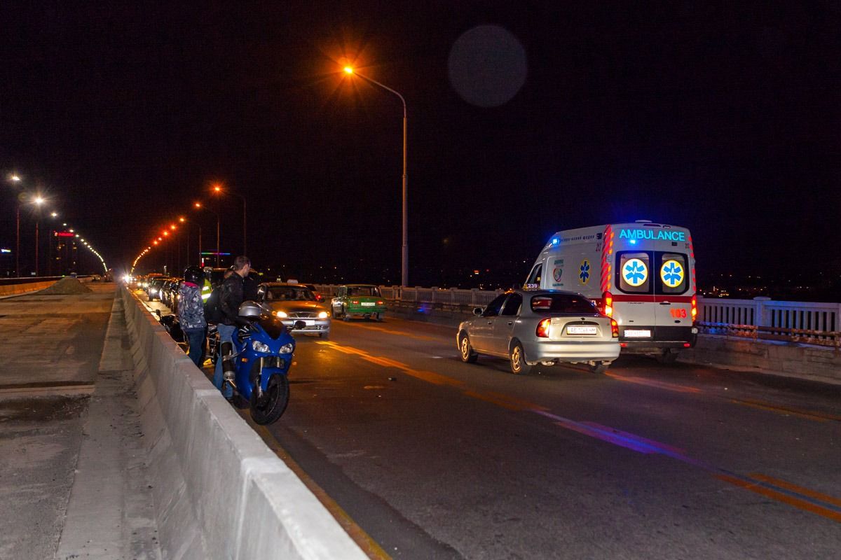 Авария произошла этой ночью на Новом мосту: мотоциклист ехал в сторону левого берега, не заметил дорожное ограждение, из-за чего упал и перевернулся.