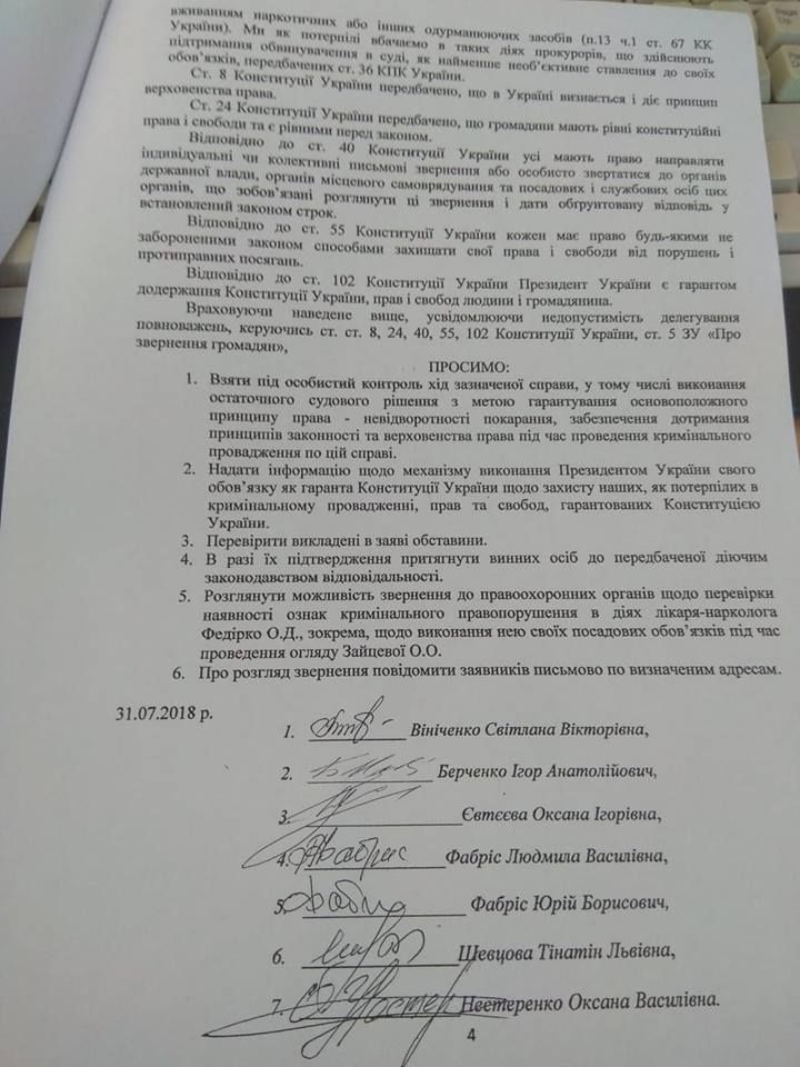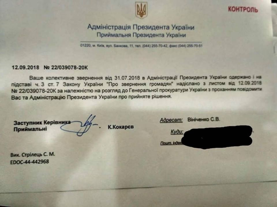 Люди обратились с просьбой к Петру Порошенко, как к гаранту Конституции, чтобы он защитил их права и свободы, взял под личный контроль ход дела, проверил многочисленные нарушения, а в случае их подтверждения – повлиял на привлечение виновных к ответственности.