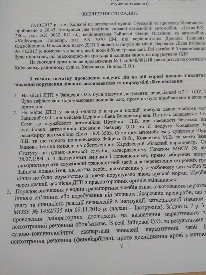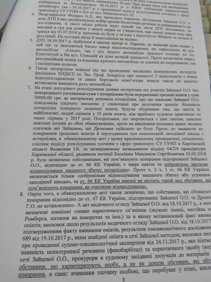 «Речь идет о состоянии, в котором управляла авто Зайцева, пропавшем наркологе Федирко, неустановленной скорости Лексуса и неопознанном красном автомобиле, с которым могли быть гонки в день трагедии. Также, особое внимание просят уделить «частичному возмещению ущерба», а не полному, как того требует закон и опиатам, которые «характеризуют личность», а не влияют на степень вины», - говорится в посте.