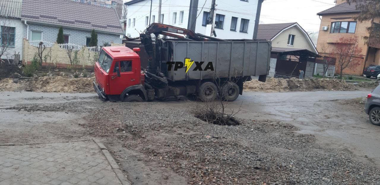 Вот и получилось, что грузовой автомобиль не смог проехать, а провалился колесами под асфальт.