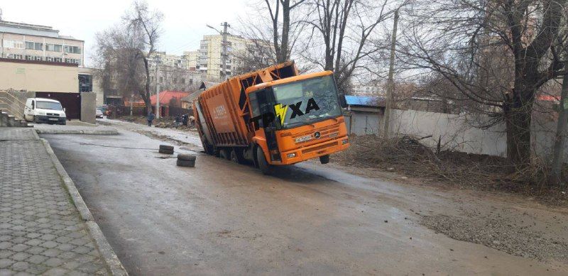 Дуэль по-днепровски: в Днепре на Подолинского мусоровоз и грузовик провалились колесами под асфальт