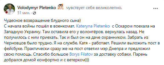 С начала войны пошёл в военкомат. Kateryna Pletenko с Оскаром поехала на Западную Украину. Там оставила его у волонтёров, вернулась назад. Не получилось с ним приехать. Так и был он на даче охранником. Забрать из Черновцов было трудно. Я на службе. Катя - работает. Решили выложить пост в фейсбуке. Практически сразу же на пост ответил мэр Днепра и предложил свою помощь. Спасибо большое Borys Filatov за доставку собаки. Парень добрался домой комфортно и с ветерком, - написал в соцсети Владимир Плетенко.