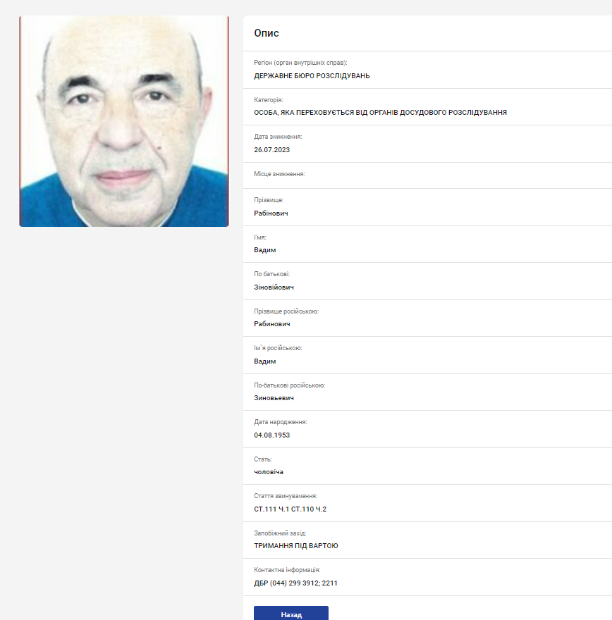 Согласно сообщению, Рабинович - "лицо, которое скрывается от органов досудебного расследования".