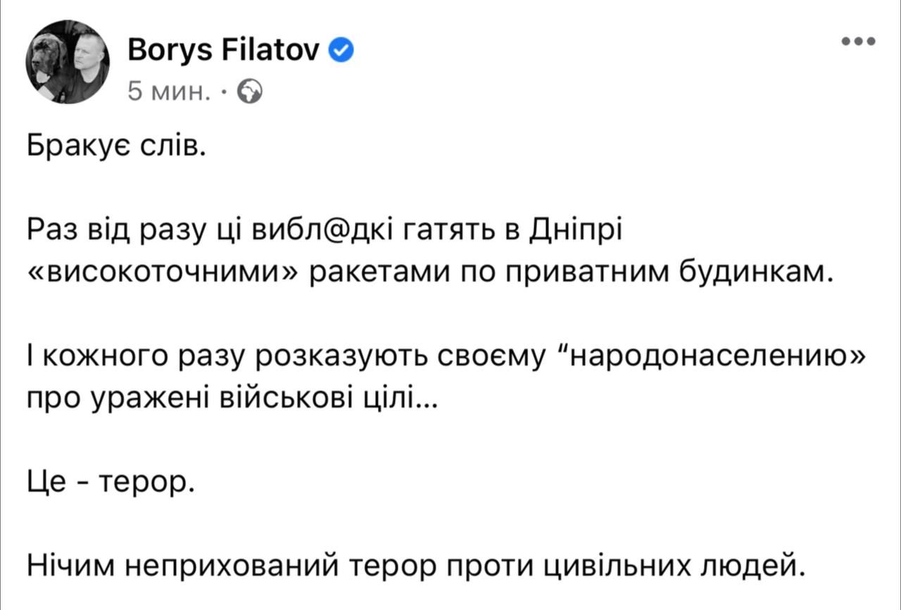 Не хватает слов. Раз за разом эти выбл@дки лупят в Днепре «высокоточными» ракетами по частным домам. И каждый раз рассказывают своему "народонаселению" об пораженных военных целях… Это – террор. Ничем нескрываемый террор против гражданских людей, – написал городской голова.