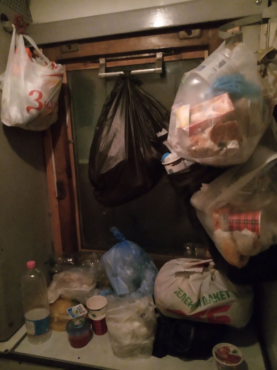 Точно не стоит брать с собой в дорогу молочные продукты. В вагонах очень тепло и окна не открываются. Поэтому единственный вариант сохранить продукты - вынести их поближе к тамбуру. Вот так было в вагоне, в котором ехал наш журналист.
