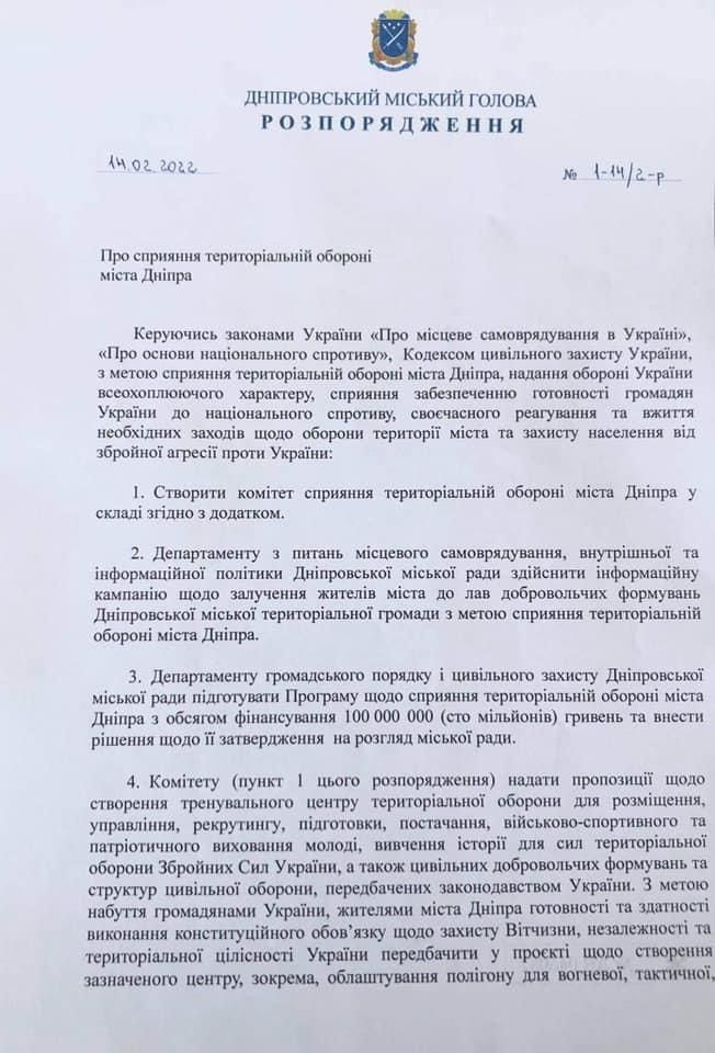 Филатов о создании Центра территориальной обороны в Днепре: «Пока кто-то паникует, мы спокойно готовимся»