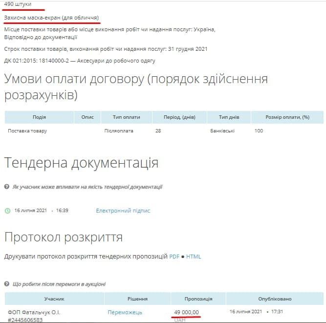 Предприниматель должна поставить 490 масок-экранов. За это департамент заплатил 49000 гривен. То есть одна маска-экран стоит 100 гривен.