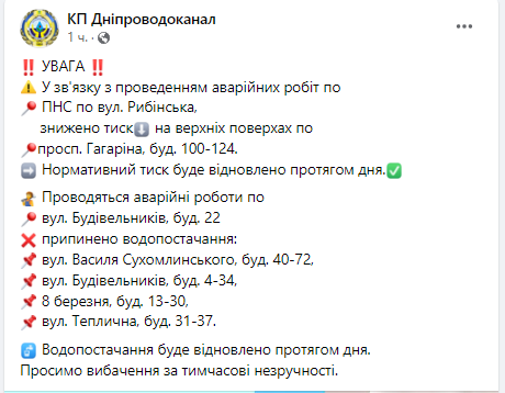 Сегодня, 27 сентября, некоторые жители Днепра останутся без воды.