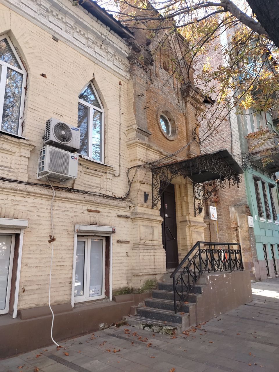 Здание было построено в 1880-х годах. Высотой оно в 2 этажа и выполнено в готическом стиле. В глаза бросается то, как здание не похоже на традиционные старинные дома Екатеринослава – в доме «острые» и узкие окна, а также характерный декор на фасаде.