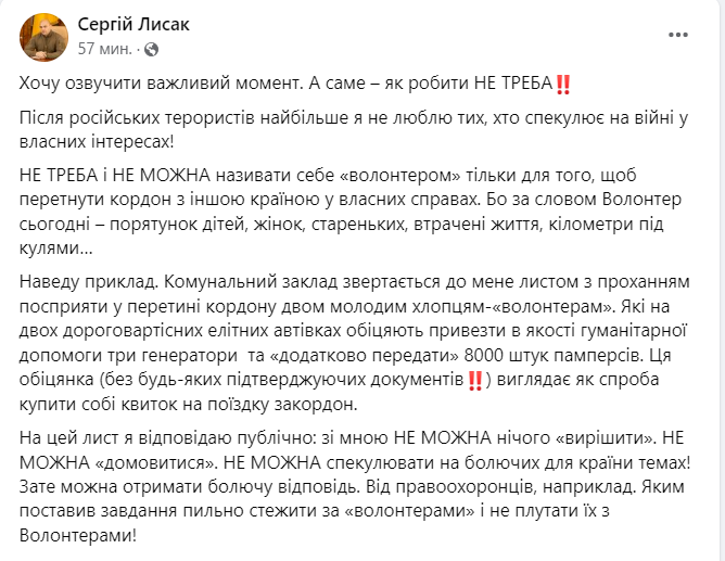 Хочу озвучить немаловажный момент. А именно – как делать НЕ НАДО. После российских террористов больше всего я не люблю тех, кто спекулирует на войне в собственных интересах! НЕ НАДО И НЕЛЬЗЯ называть себя «волонтером» только для того, чтобы пересечь границу с другой страной по собственным делам. Потому что за словом Волонтер сегодня – спасение детей, женщин, стариков, потерянные жизни, километры под пулями… Приведу пример. Коммунальное предприятие обращается ко мне письмом с просьбой помочь в пересечении границы двум молодым ребятам-«волонтерам». Которые на двух дорогостоящих элитных автомобилях обещают привезти в качестве гуманитарной помощи три генератора и «дополнительно передать» 8000 штук памперсов. Это обещание (без каких-либо подтверждающих документов) выглядит как попытка купить себе билет на поездку за границу, – написал Сергей Лысак.