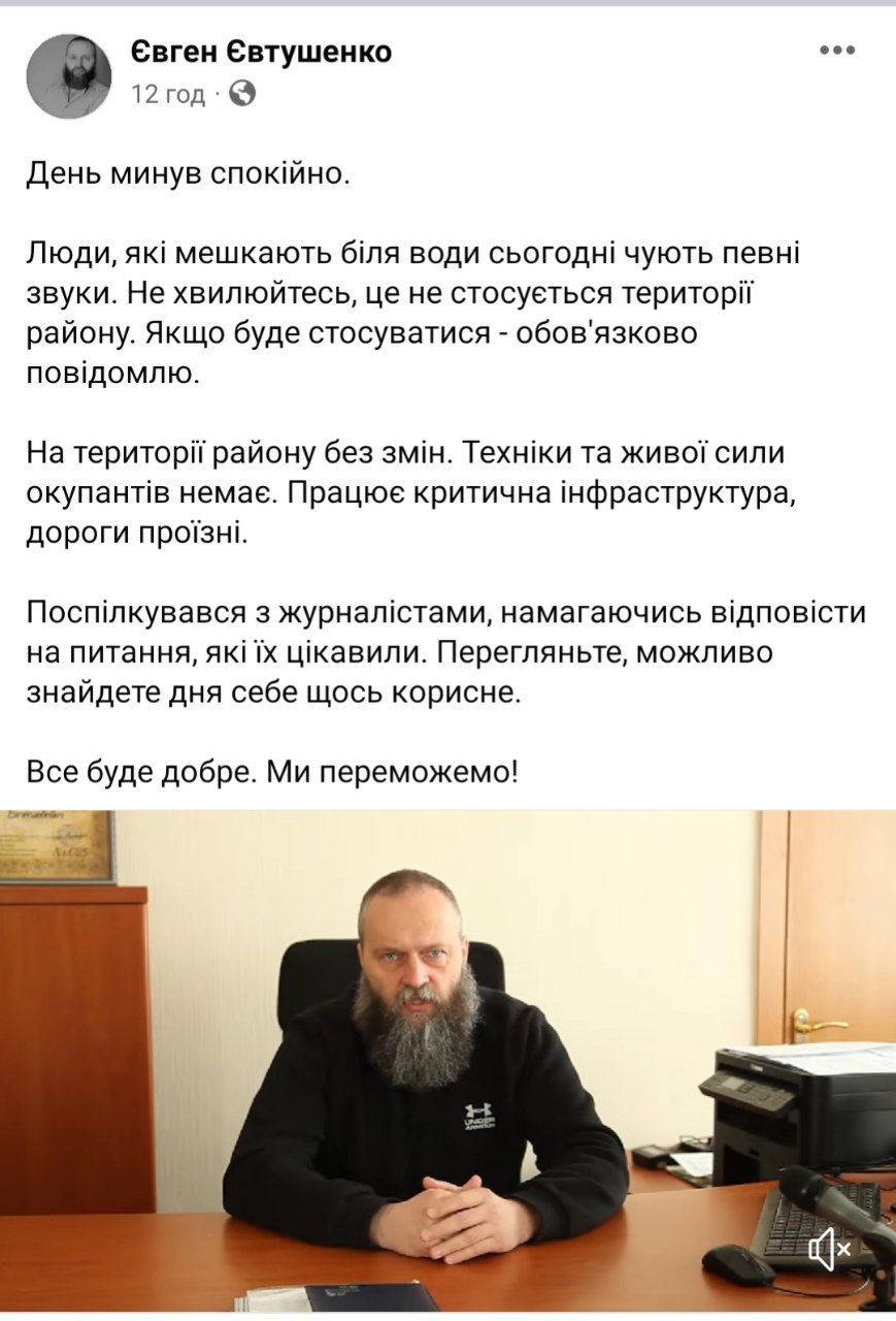 Глава Никопольской районной военной администрации Евгений Евтушенко успокоил жителей города и района. По его словам, звуки выстрелов, которые люди иногда слышат у воды, не касаются Никопольского района. Он уверил жителей, что если какие-то изменения будут о них расскажут сразу.