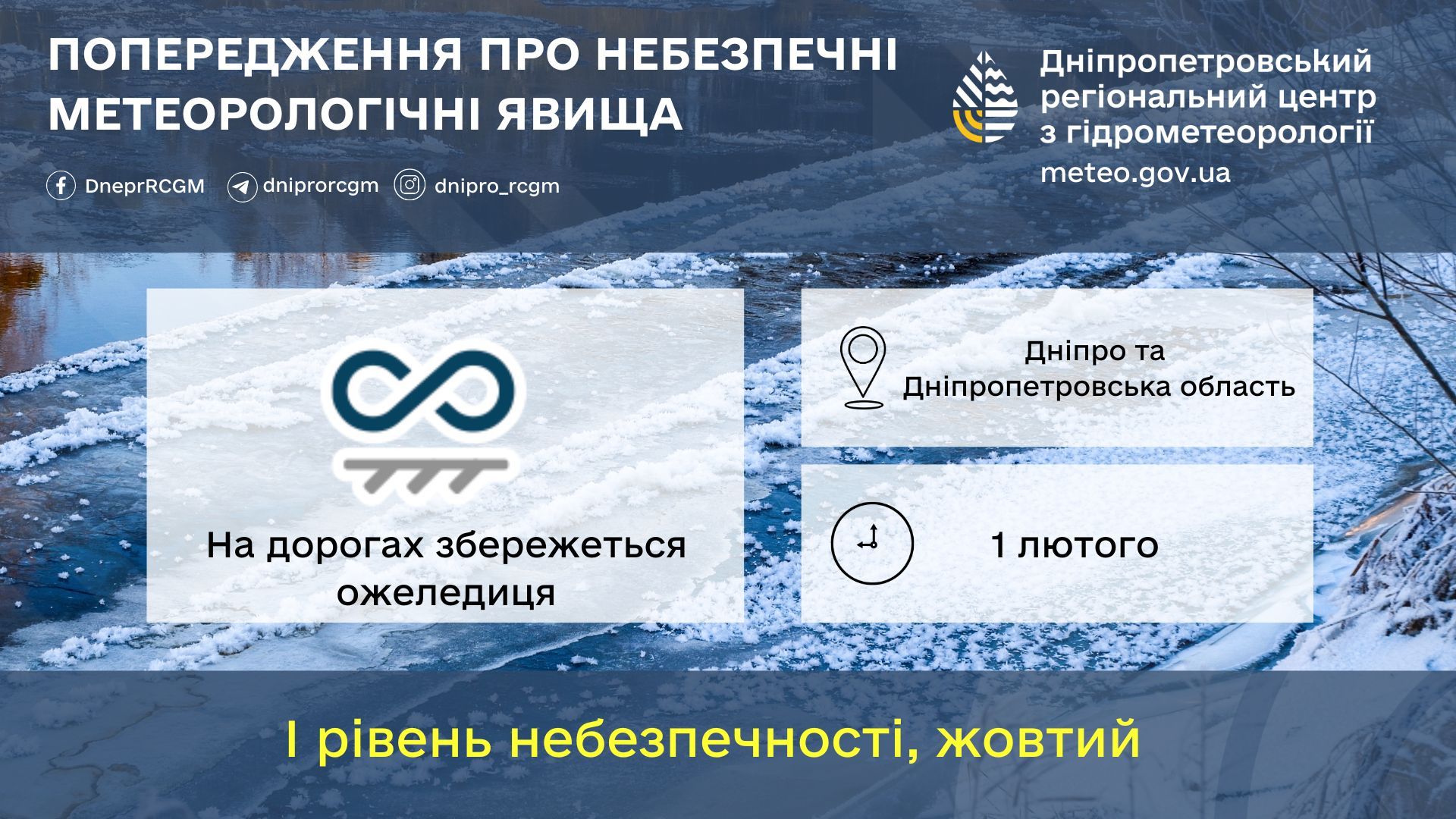 Сегодня, 1 февраля, в Днепре и области сохраняется гололедица. Поэтому объявлено предупреждение об опасных метеорологических явлениях. Об этом сообщают в Днепропетровском региональном гидрометцентре.