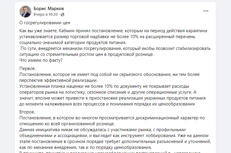 "Это вполне может привести к приостановке реализации указанных продуктов питания до момента налаживания всех процессов и понимания порядка их ценообразования", – написал Марков в Facebook.