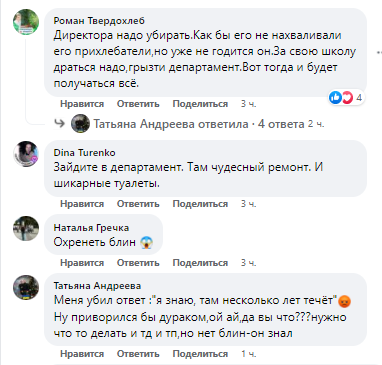 "Два года воевали, чтобы поменять шкафы в классе, уже начали двери отпадать на детей, решили заказывать. Пришли разбирать старые, за ними плесень, грибок, здоровенные черные тараканы, и на одной стене за шкафом, где раковина, мокрая стена. Начали искать причину, течет стояк - мокрые два класса! Пришли к нашему директору, и знаете, что он говорит: "Я знаю, она уже несколько лет течет, я вам ничем помочь не могу, департамент тоже не поможет". И даже в класс не пришел посмотреть. После скандала в кабинете - побежали, но предложили перекрыть весь стояк и нам пойти в другой класс, пока они своими силами это починят", - пишет автор поста.