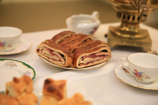На десерт не мандарины и конфеты, а пряники с чаем из самовара 19 века, который является экспонатом музея. Кстати, тогда праздничные пряники покрывали сусальным золотом для блеска.