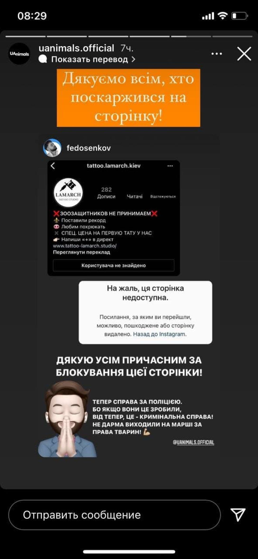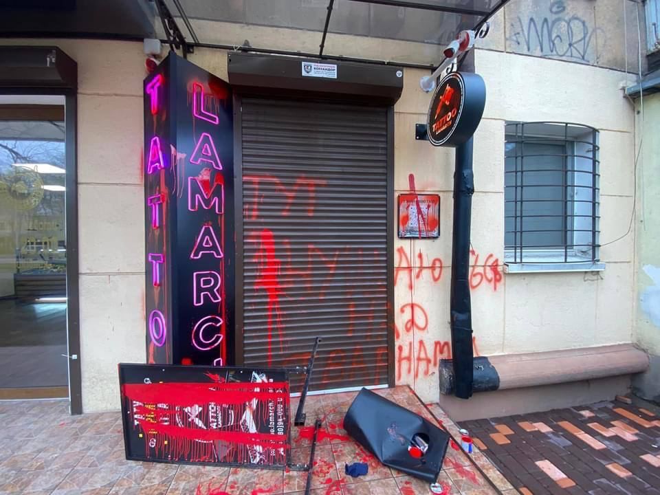 Кроме этого, в Одессе один из тату-салонов сети залили красной краской и написали: «Здесь издеваются над животными».