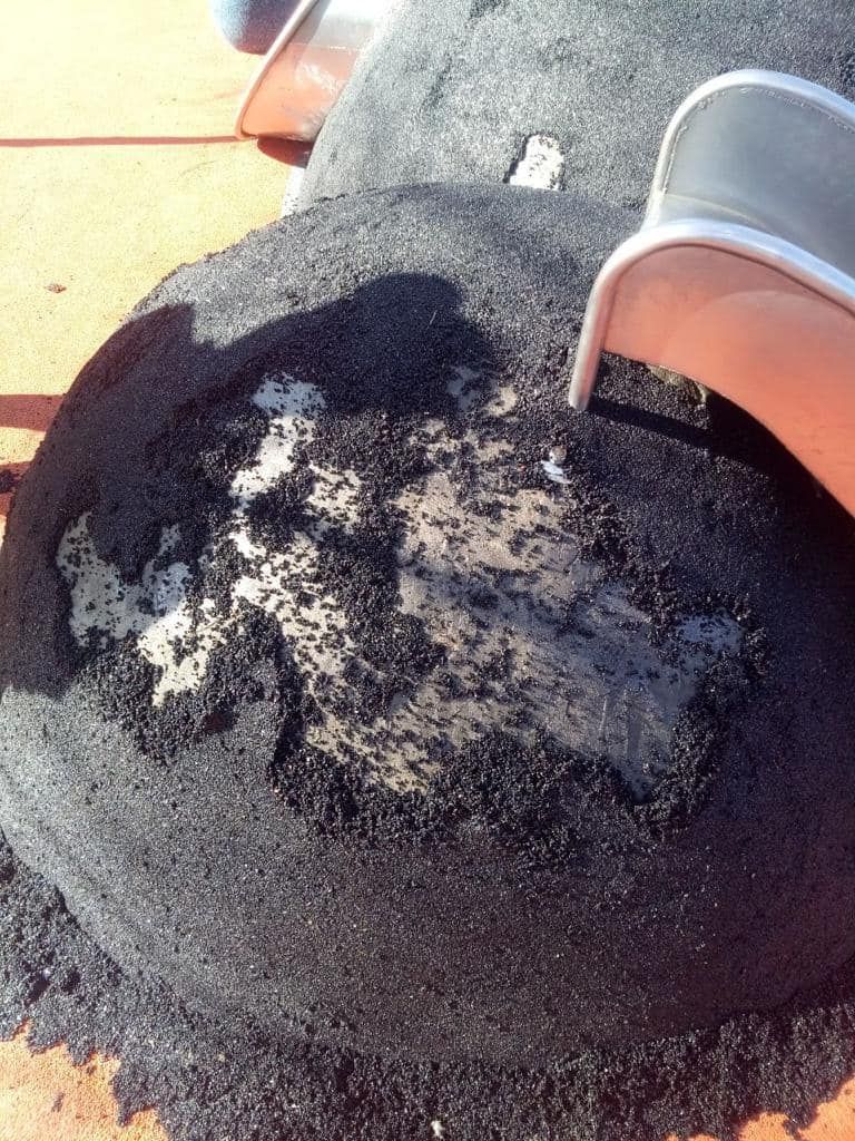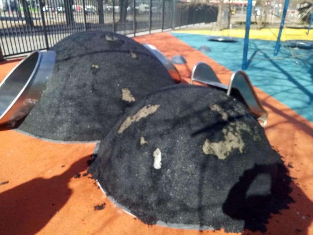 Однако и тут уже успели отметиться вандалы. Так, неизвестные целенаправленно ободрали подложку под антитравматичное покрытие.