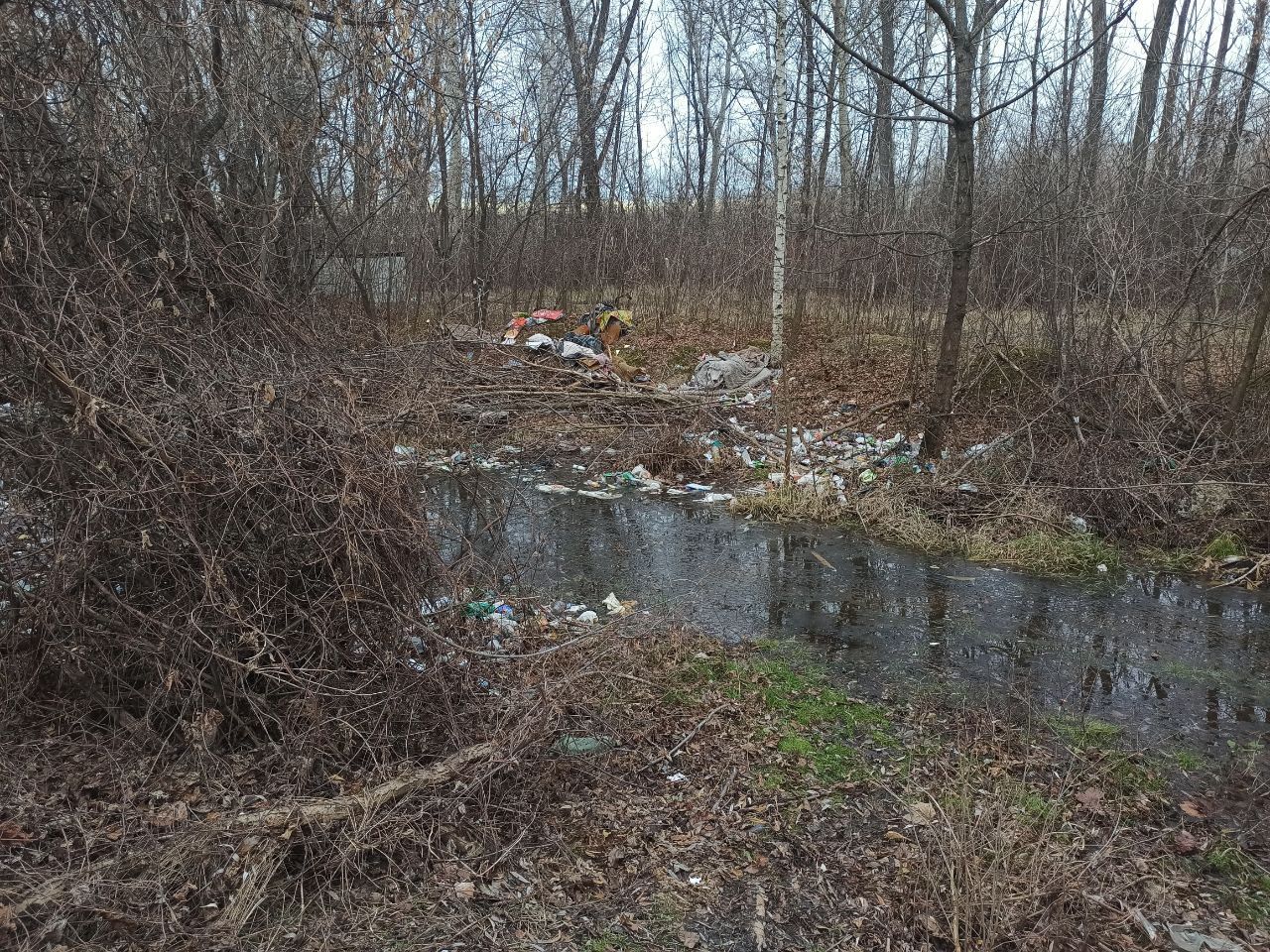 На набережной бездомные обустроили собственное жилье. В зарослях возле реки видна маленькая избушка и груда вещей.