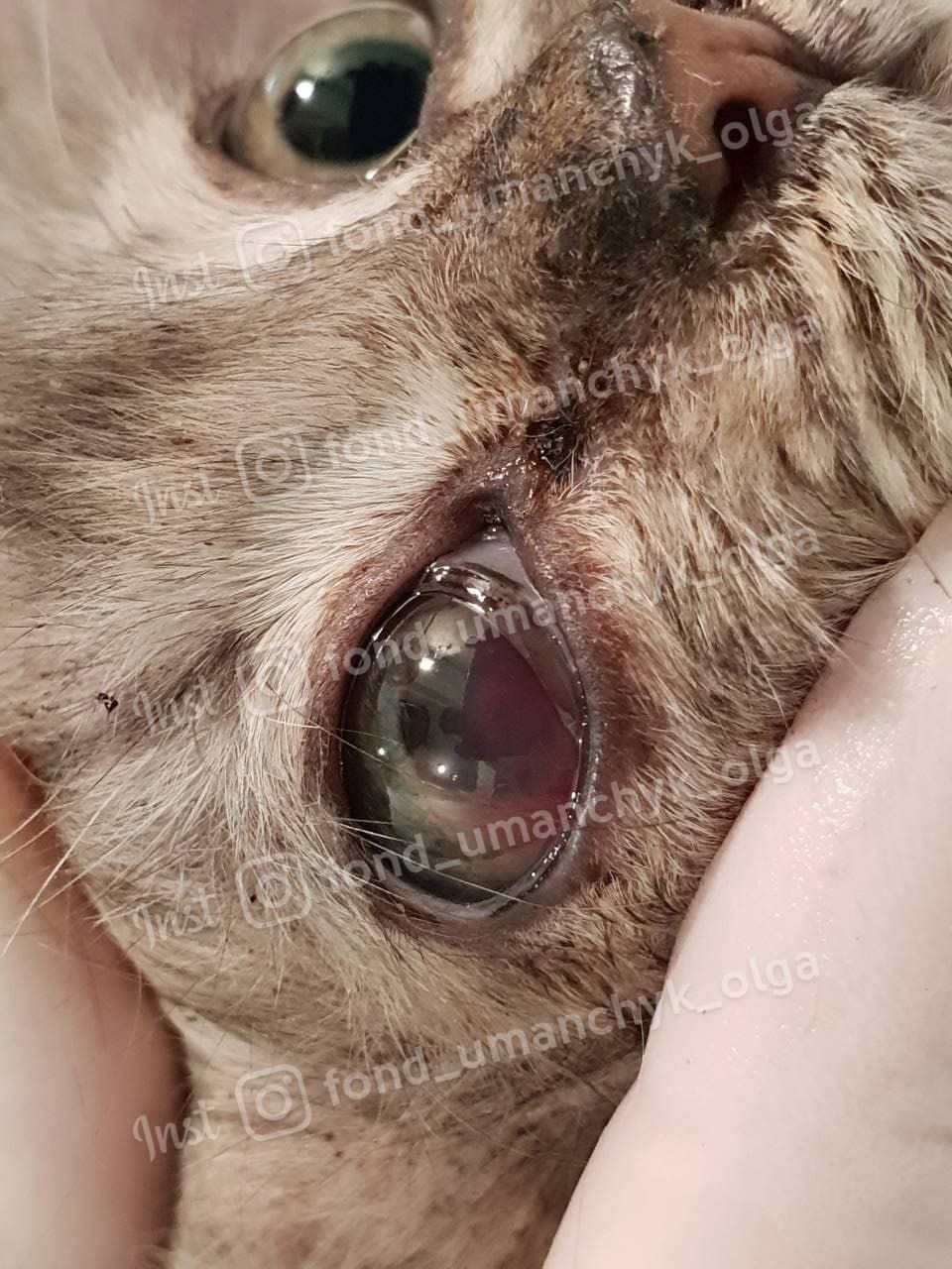 Маленького котенка нашли возле дороги. Волонтер предполагает, что его бросили на дорогу искалеченного. У животного черепно-мозговая травма, рахит пробита кожа и мышца. На спине у него гнойное воспаление, откачали уже 15 кубиков гноя. А в глазу кровоизлияние. Котенок в тяжелом состоянии и нуждается в помощи ветеринара. Сейчас волонтеры попросили одну из клиник осмотреть кота в долг, но чтобы начать его лечит необходимо внести предоплату.