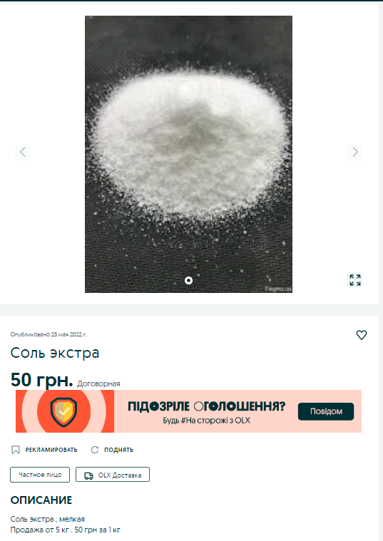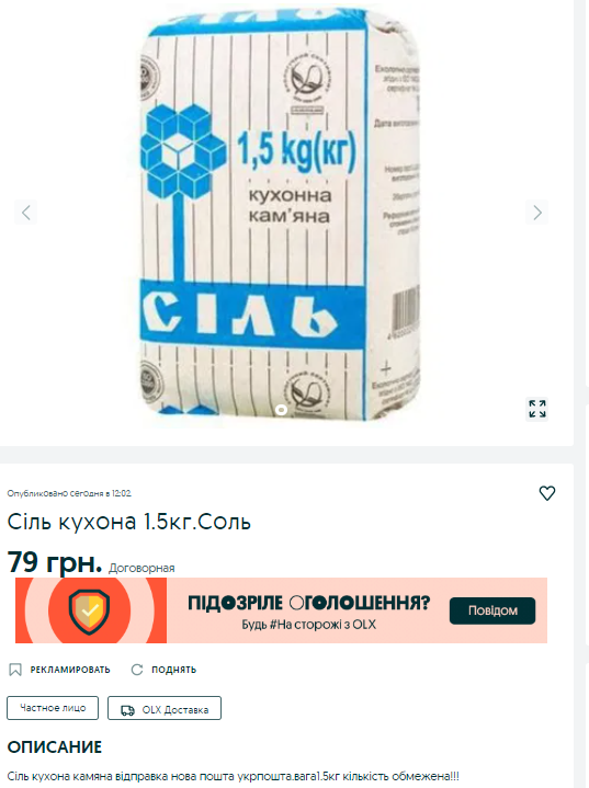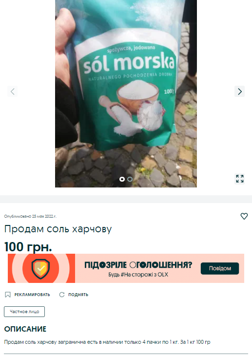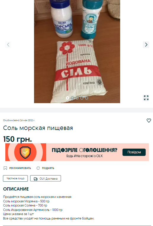 Купить полкило морской соли или йодированной аж целый килограмм обойдется в 150 грн. Автор объявления о продаже отмечает, что продает товар так дорого не потому что хочет заработать, а чтобы помочь военным в больницах. Все вырученные средства от продажи соли пойдут на помощь раненым.