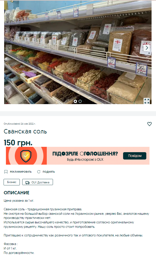 Экзотическая грузинская сванская соль обойдется в Днепре по 150 грн за кило. Продавец отмечает, что соль изготовлена по оригинальному рецепту и ее «стоит попробовать».