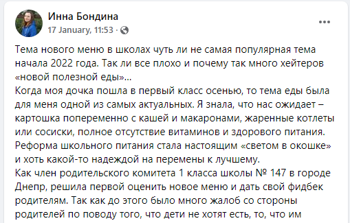 Мама первоклассницы из днепровской школы №147 Инна Бондина, рассказала о своем опыте проверки питания в школе. По ее словам, отдавая ребенка в первый класс, она примерно знала чем могут кормить ее дочь. Чередование картошки, каши и макарон в качестве гарнира, жареные котлеты с сосисками и отсутствие фруктов и овощей. Поэтому лично ей реформа питания понравилась.