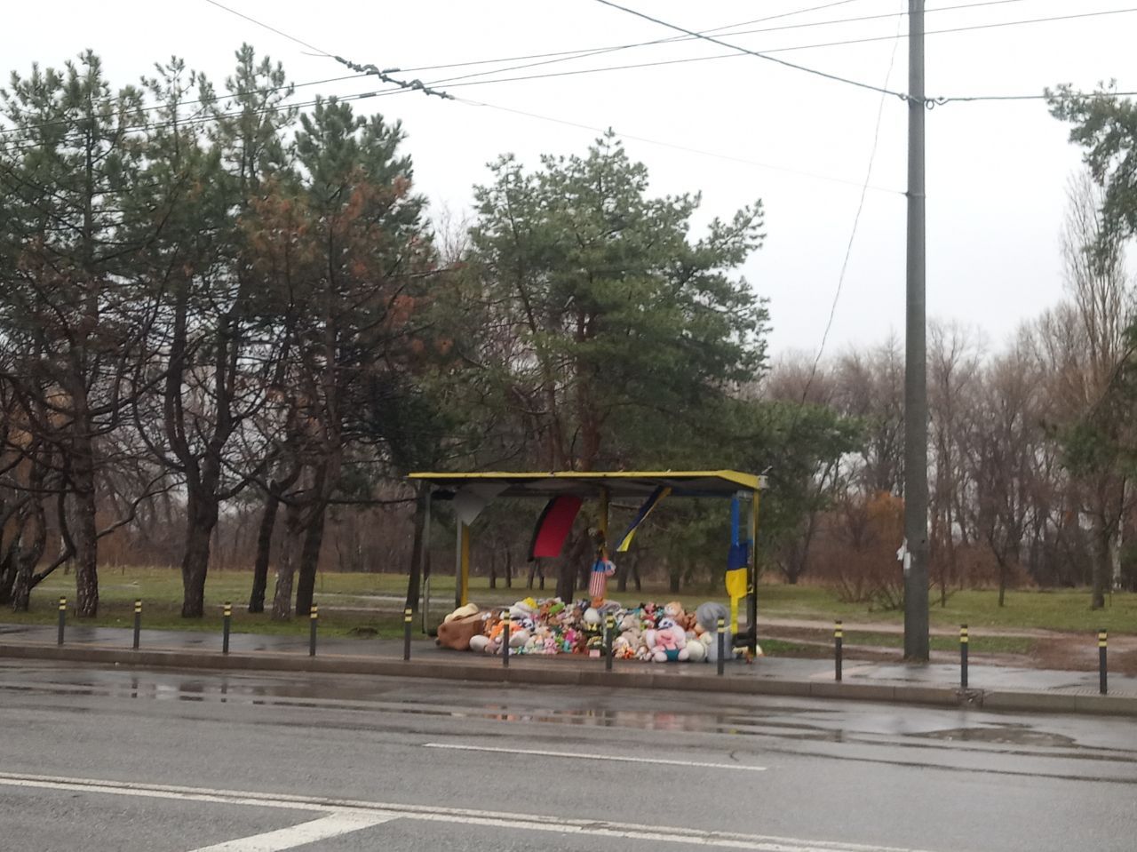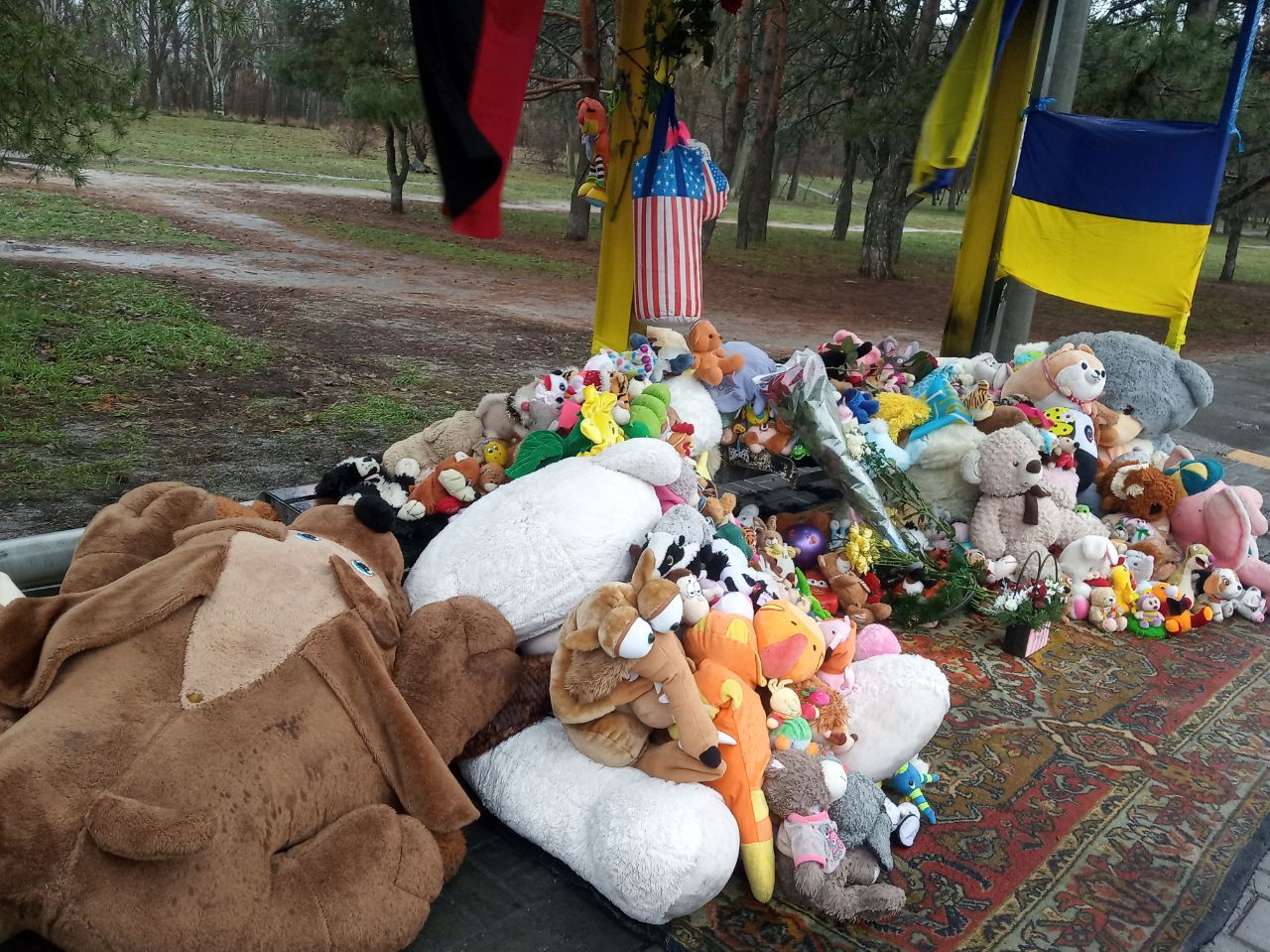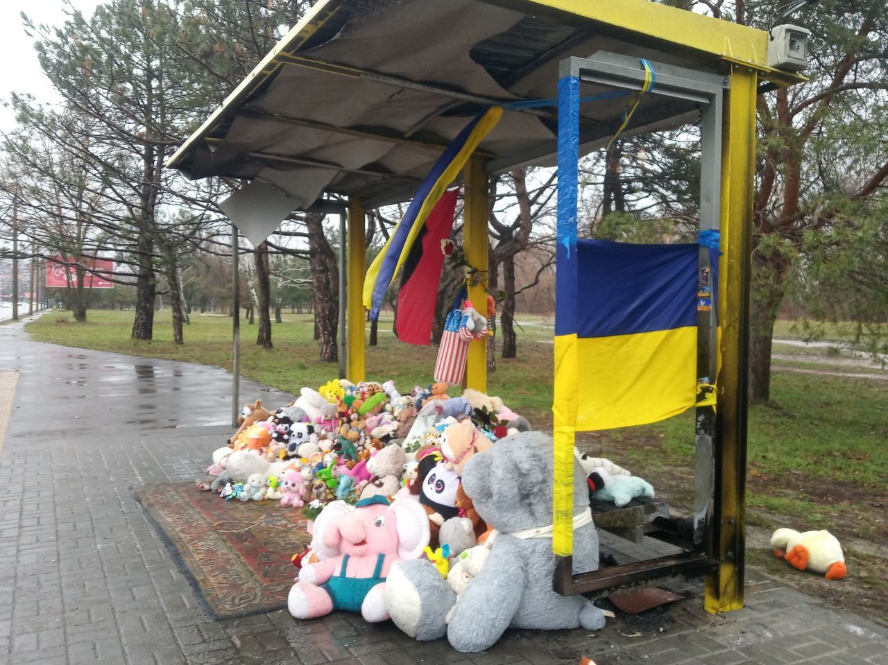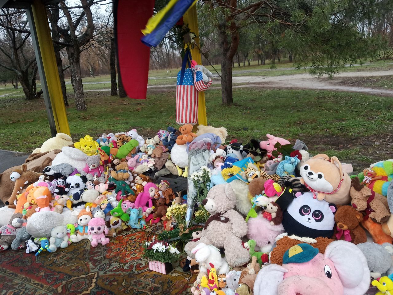Туда все желающие приносили игрушки и цветы, а также зажигали лампадки в память о погибших во время ракетного удара 14 января 2023 года.