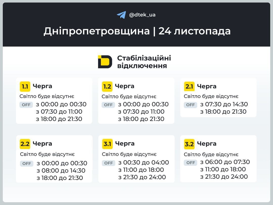 Как будут отключать свет в Днепре 24 ноября: графики ДТЭК и ЦЭК
