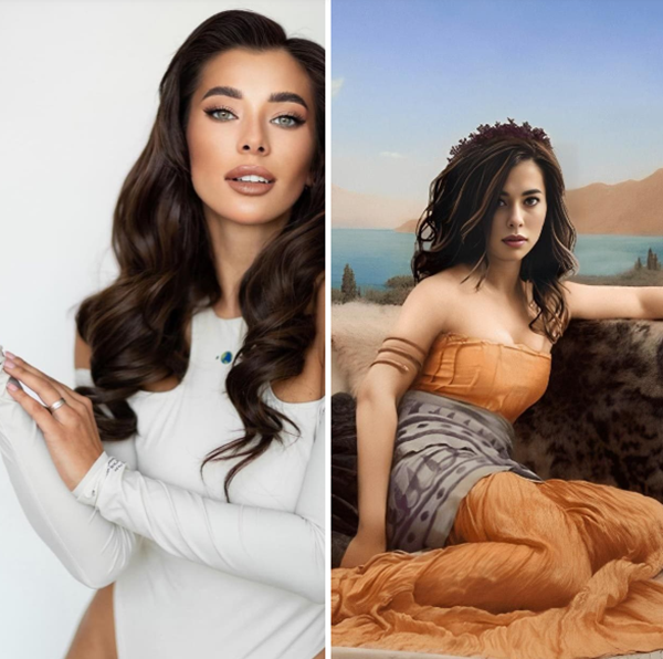 Победительницу конкурса «Мисс Украина Вселенная 2021» и модель родом из Днепра Анну Неплях нейросеть изобразила в виде девушки, сидящей на фоне моря и гор. Это картина Уильяма Говарда «Девушка в венке из фиалок и мантии шафранового оттенка».