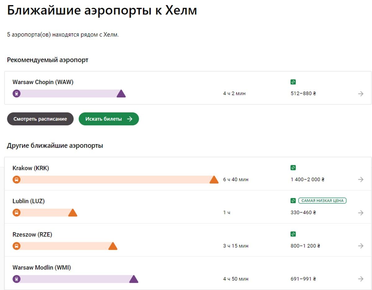 Ближайший аэропорт Хелм находится в Люблине. Добраться до него на автобусе обойдется максимум в 460 грн с человека. Чтобы добраться до крупнейшего аэропорта страны Кракова можно за 2000 грн максимум. Дорога до аэропорта в Варшава занимает меньше времени и обойдется в два раза дешевле. В обоих аэропортах можно воспользоваться лоукостерами Wizz Air и Ryanair. Здесь легко купить дешевые билеты в Болгарию, Грецию, Испанию, Кипр, Италию, ОАЭ, Хорватию, Португалию, Британию, Германию, Францию, Швецию, Турцию и Тунис.