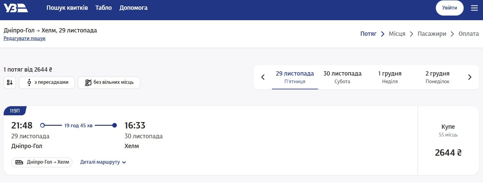 Да, из нашего города можно прямым поездом добраться до польского Хелма. Время в пути – около 19 часов. Билет в один конец в купе обойдется в 2644 грн. Поезда курсируют каждый день. Купить билет можно за неделю до нужной даты.
