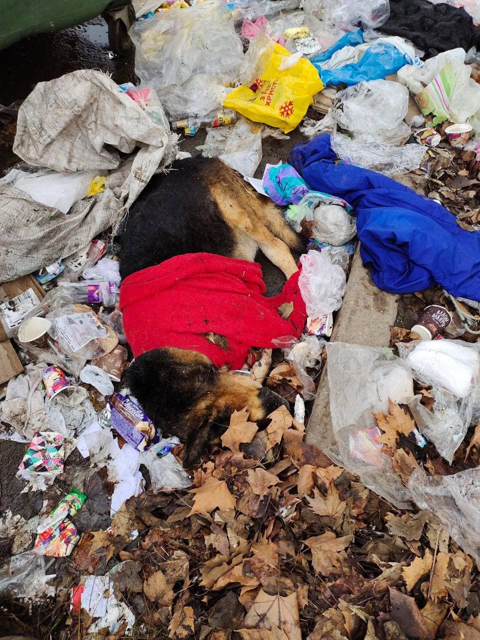 Мертвую собаку обнаружили на перекрестке улиц Надежды Алексеенко и Извилистой. Лежала она возле возле мусорных баков в куче старых пакетов и одежды. Тело животного было накрыто красным шарфом. Пес выглядит ухоженным, поэтому можно предположить, что у него были хозяева. Но он мог умереть на этом месте и сам.
