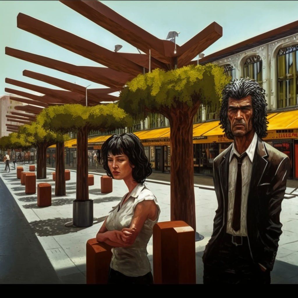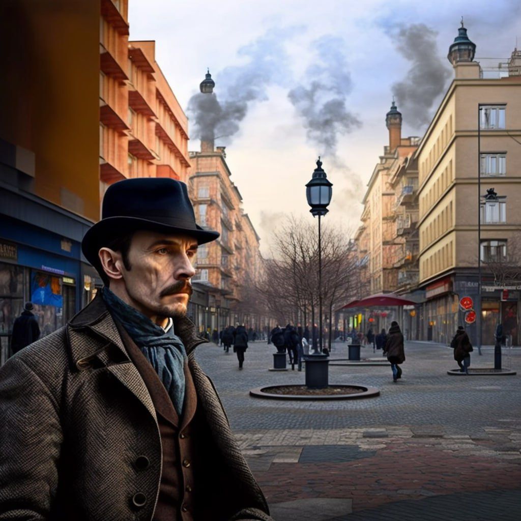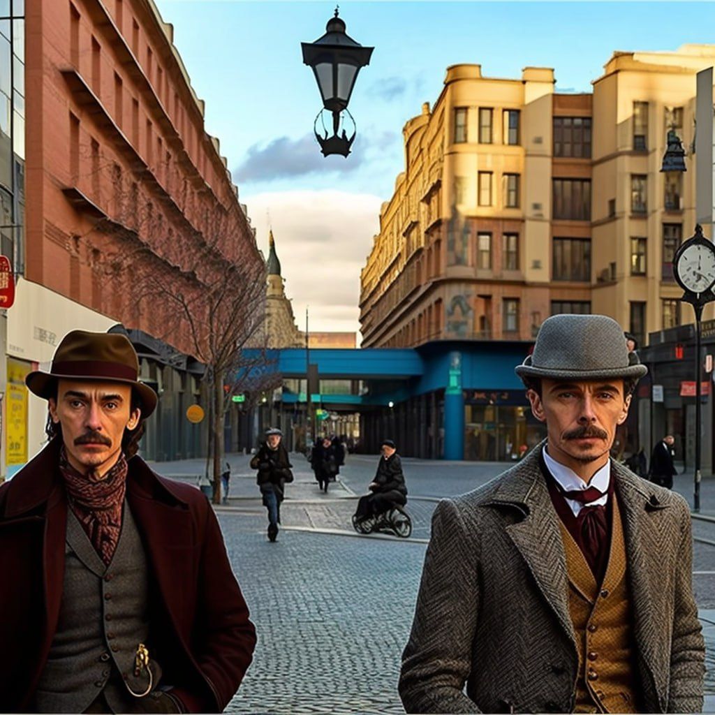 По мнению нейросети так выглядел бы бульвар, если бы злодей из кино убегал от Шерлока Холмса и доктора Ватсона.