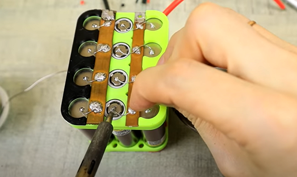 Далее мы соединяем контакты в параллельную цепь с помощью скоб от степлера или проволоки. Их нужно припаять к батарейкам. После – соединяем цепи последовательно. Перед пайкой нужно все поверхности обезжирить.